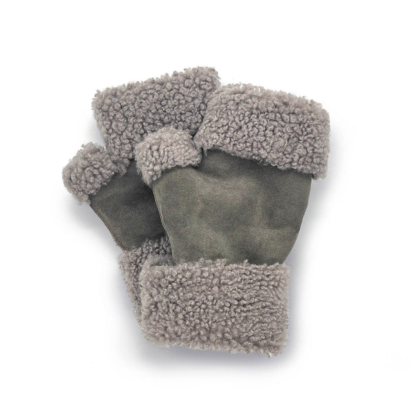 These Dove Grey fingerless gloves are made using soft, wavy mid grey sheepskin offcuts with a suede finish. Their practical design is great for accessoristas and dog walkers alike – and adjust the cuffs for extra warmth.