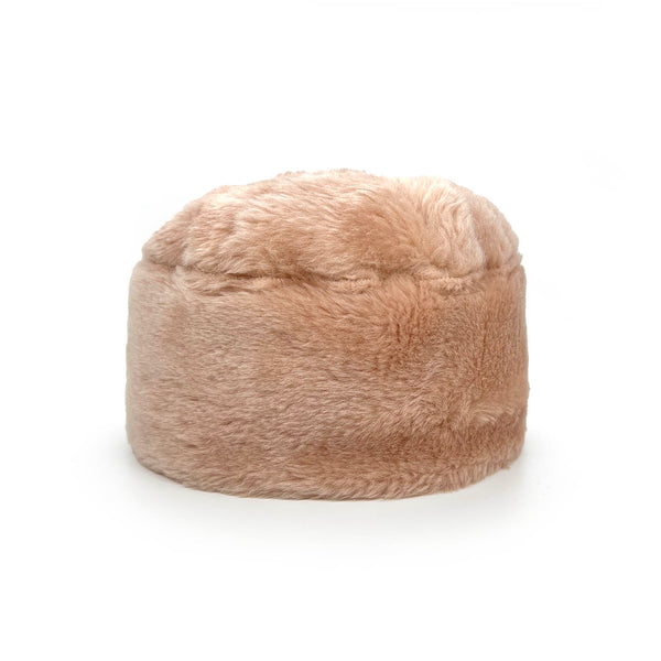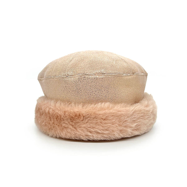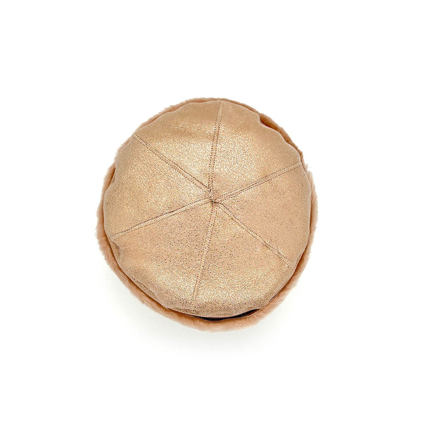 GAN, our best-selling reversible hat model, is handmade using beautiful sheepskin offcuts. This particular hat is made of super soft peachy pink sheepskin with a gold flecked pale pink leather reverse.