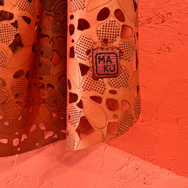 Our LEATHER LACE scarves are a good example of MAKU’s ‘minimum intervention’ approach to making use of production discards. As soon as we discovered these stunning, intricately cut coral red leathers we knew just what we had to turn them into… with some careful cutting, plus the addition of a single seam and our MAKU logo tab, we have transformed surplus stock leather into limited edition statement accessories