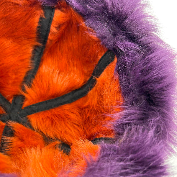 This one-of-a-kind hat is handmade from red-orange suede finish sheepskin offcuts and has a luxurious purple Toscana sheepskin trim.