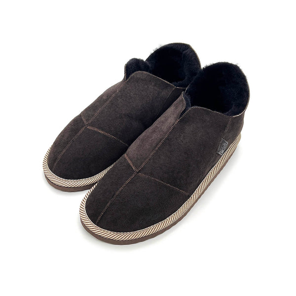 MERDANA Dark Chocolate are handmade using a rich brown sheepskin offcuts with a black sheepskin reverse that contrasts with the natural sheepskin underfoot. These cosy slippers give purpose to lovely suede offcuts with occasional natural imperfections such as subtle tonal variations, slight mottling or roughness of texture. We are all about putting such ‘imperfect’ materials to good use and this batch is most likely to show to show some subtle mottling to the suede finish (please see photos).