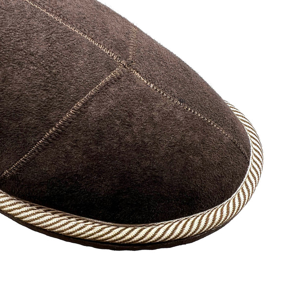 MERDANA Dark Chocolate are limited edition slippers – meaning the number of pairs we produce per batch is determined by the amount of sheepskin or leather waste we can source in a particular finish. Everything is designed so even the smallest of offcuts can be utilised during our production process.