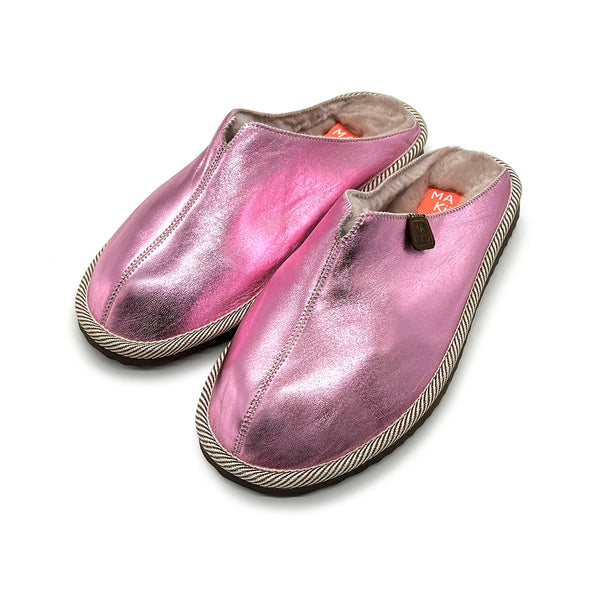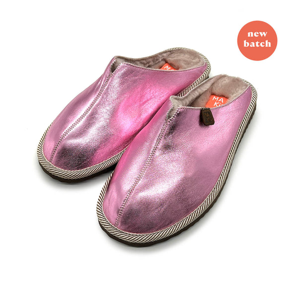 POLIN FIT Metallic Orchid's outers have been made using beautiful dusky pink metallic leather seconds whilst their inners are lined with super-soft sheepskin offcuts in pastel pink. They are finished with our trademark striped trim and have light, hard-wearing textured EVA soles.