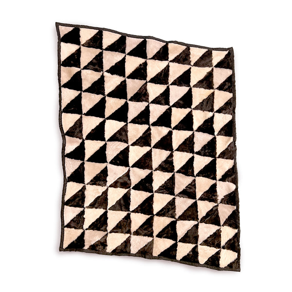 Our TRIANGLE patchwork throws are designed to make use of the smallest of sheepskin offcuts. Made using super-soft warm beige + dark brown sheepskin, it has a stone leather + mid-grey suede reverse and is finished with a black fabric trim.