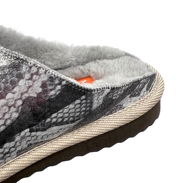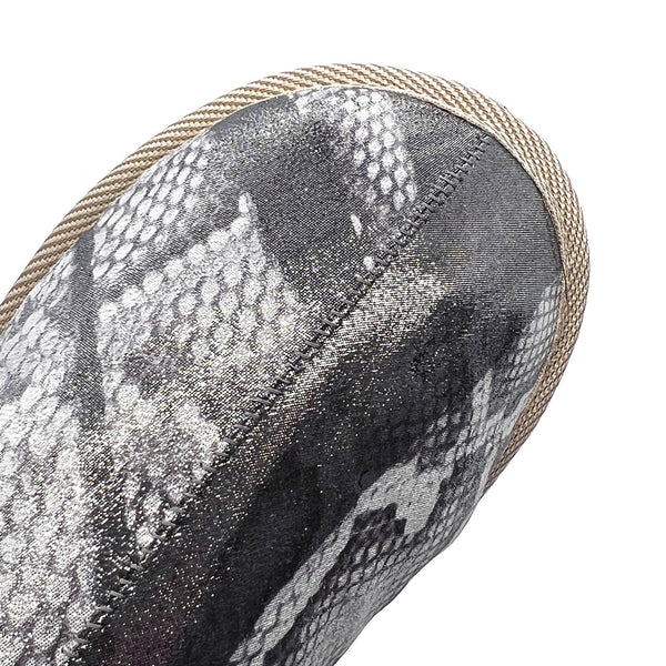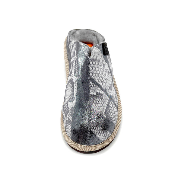POLIN Punk Snake Silver is our new rebellious reptilious batch! Handmade using leather seconds printed with a bold snake scale design in silver shades, they are lined with cosy pale grey sheepskin offcuts. POLIN Punk Snake Silver have a hidden layer of handmade woollen felt underfoot, are finished with our trademark striped trim and have light, hard-wearing textured soles.