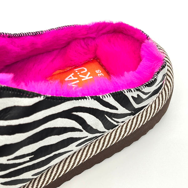 POLIN Zebra Print + Neon Pink have luscious pink sheepskin inners, are finished with our trademark striped trim and have light, hard-wearing textured EVA soles. In cooler months POLIN’s sheepskin lining ensures your feet are beautifully cosy, whilst in warmer months the same inner allows your feet to breathe as sheepskin naturally wicks away any moisture. Stylish comfort, whatever the weather!